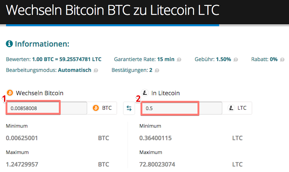 3. Nun müssen Sie den gewünschten Betrag an Zielwährung (Litecoin) (2) oder Quellbetrag (Bitcoin) (1) eingeben, die Sie umtauschen möchten. Wenn Sie den Zielbetrag ändern, wird der Quellbetrag automatisch neu berechnet und umgekehrt.