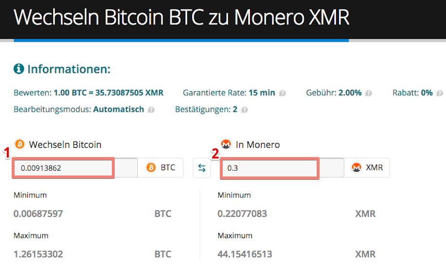 3. Nun müssen Sie den gewünschten Betrag an Zielwährung (Monero) (2) oder Quellbetrag (Bitcoin) (1) eingeben, die Sie umtauschen möchten. Wenn Sie den Zielbetrag ändern, wird der Quellbetrag automatisch neu berechnet und umgekehrt.