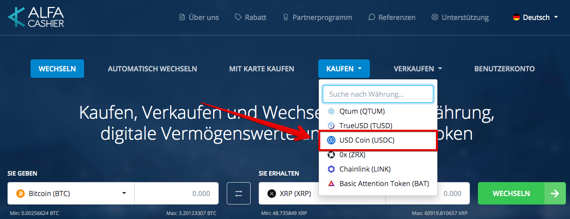 1. Wählen Sie auf der Hauptseite das Menü KAUFEN im oberen Menü und klicken Sie auf USD Coin oder besuchen Sie diesen Link direkt www.alfa.cash/buy/usdcoin