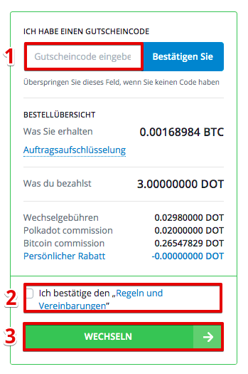 3. Nun müssen Sie den gewünschten Betrag an Zielwährung ( Bitcoin) (2) oder Quellbetrag ( Polkadot) (1) eingeben, die Sie umtauschen möchten. Wenn Sie den Zielbetrag ändern, wird der Quellbetrag automatisch neu berechnet und umgekehrt. Wenn Sie den Zielbetrag ändern, wird der Quellbetrag automatisch neu berechnet und umgekehrt.