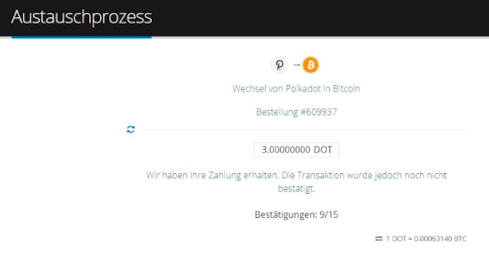 7. Nachdem wir eine unbestätigte Bitcoin-Transaktion von Ihnen erhalten haben, wartet das System, bis Ihre Transaktionen die erforderliche Menge an Bestätigungen erhalten. Sobald Ihre Transaktion 15 Bestätigungen erhält, wird die Bestellung automatisch abgeschlossen.