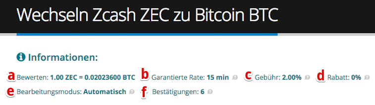 Im linken Block können Sie die gleichen Informationen wie in Methode 1 (Punkt 2) zu garantierter Rate, Verarbeitungsmodus, erforderlicher Anzahl an Bestätigungen, Systemgebühr und Rabatt ansehen.