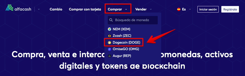 1. En la página principal, elija el menú COMPRAR, el cual se encuentra en el menú superior y haga clic en Dogecoin o visite directamente este enlace www.alfa.cash/es/buy/dogecoin