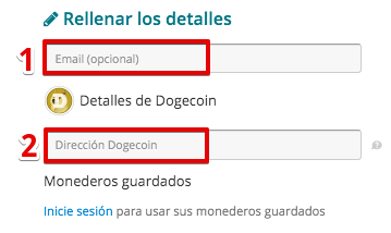 4. Introduzca su dirección de correo electrónico (1) (si desea recibir un correo electrónico cuando finalice su pedido de intercambio o dejarlo en blanco, el campo del correo electrónico es completamente opcional). Introduzca la dirección de su billetera de Dogecoin (2). Si está conectado, puede guardar la dirección de esta billetera para reutilizarla posteriormente: