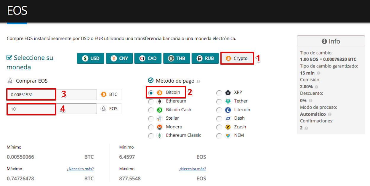 2. Seleccione la divisa de pago (1) (en nuestro caso es la Criptomoneda), seleccione el método de pago (2) - Bitcoin. Introduzca el importe de origen ( Bitcoin(3) o el importe de destino ( EOS (4): el sistema volverá a calcular automáticamente según dónde introduzca la cantidad.