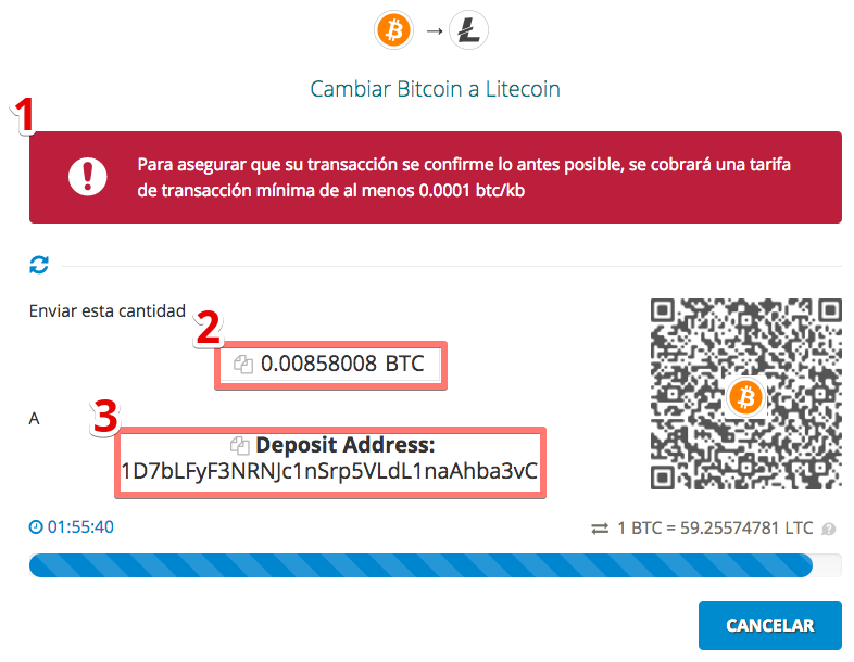 6. La siguiente página es la página de pago. Debe enviar la cantidad exacta que se muestra (2) a la dirección de depósito (3). La advertencia en (1) es una recomendación opcional para la tarifa del minero, por lo tanto su transacción se confirmará rápidamente y no tendrá que esperar por horas. (Guía para establecer la tarifa del minero en varios clientes de bitcoin).
