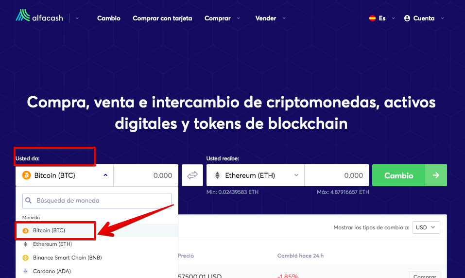 1. Vaya a la página principal Alfacash y seleccione la dirección de intercambio apropiada (por ejemplo, BTC → Polkadot (DOT)):
