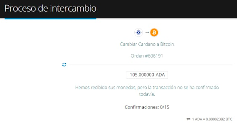 7. Después de que recibamos por parte de usted una transacción de bitcoin no confirmada, el sistema esperará a que sus transacciones reciban la cantidad requerida de confirmaciones. Una vez que su transacción obtenga 15 confirmaciones, la orden se completará automáticamente.