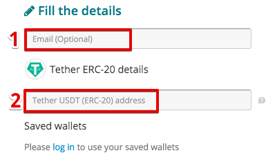 4. Enter your e-mail address (1) (if you’d like to get an e-mail when your exchange order finishes or leave it blank, e-mail field is completely optional). Enter your Tether ERC-20 wallet address (2). If you’re logged in you can save this wallet’s address for the future re-use: