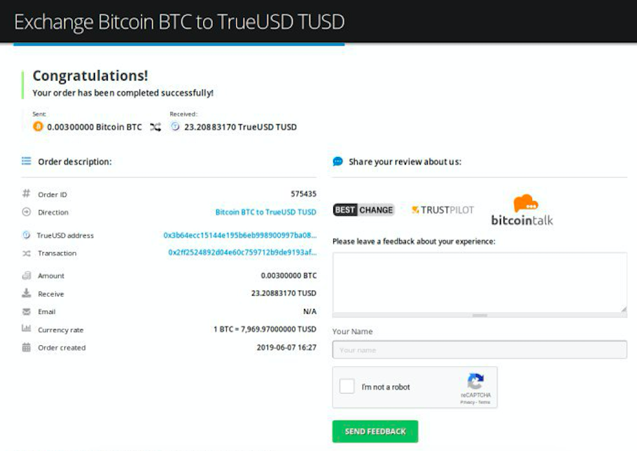 Enter either source amount ( Bitcoin) or destination amount ( TrueUSD) - system automatically recalculates depending where you enter the amount: