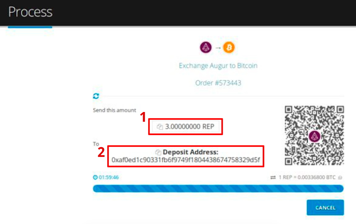 3. Now you need to enter the required amount of destination currency (2) (in our example: Bitcoin) or source amount (1) (in our example: Augur) you’d like to exchange. If you change destination amount the source amount will be automatically re-calculated and vice versa.
