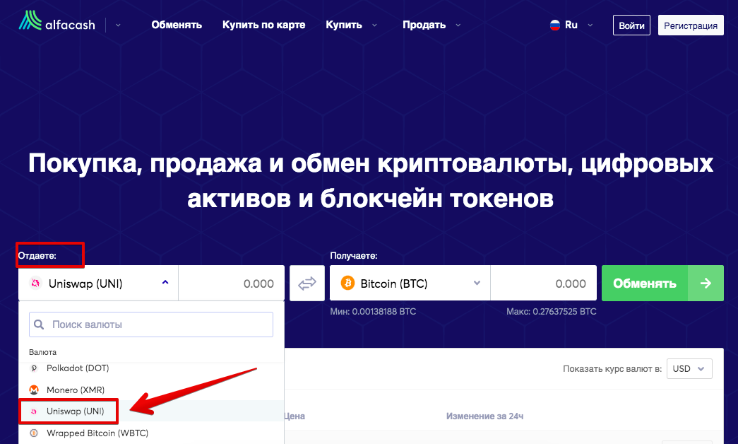 1. Перейдите на главную страницу Alfacash и выберите соответствующее направление обмена (например, UNI → BTC):
