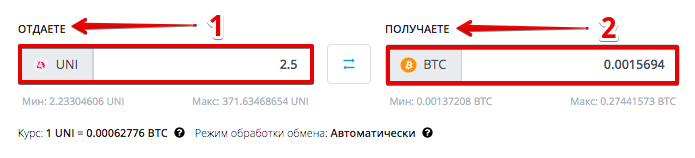 3. Введите сумму в валюте ( Bitcoin), которую хотите получить (2) или сумму в валюте, которой будете оплачивать ( Uniswap) (1). Если вы измените получаемую сумму, то сумма к оплате будет автоматически пересчитана, и наоборот.